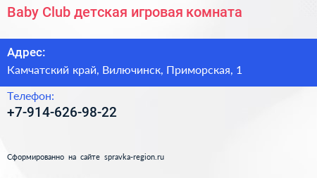 Baby Club, детская игровая комната по адресу Камчатский край, Вилючинск, Приморская, 1 в дальнейшем Организация, размещена в следующих категориях: