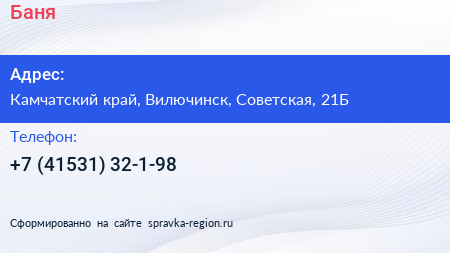 Баня по адресу Камчатский край, Вилючинск, Советская, 21Б в дальнейшем Организация, размещена в следующих категориях: