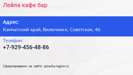 Лейла, кафе-бар по адресу Камчатский край, Вилючинск, Советская, 46 в дальнейшем Организация, размещена в следующих категориях: