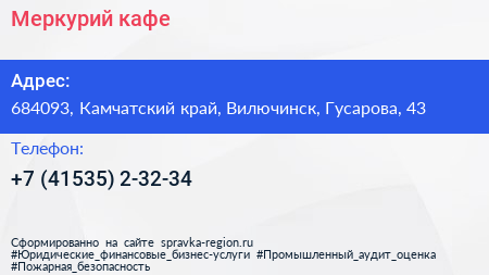 Меркурий, кафе по адресу 684093, Камчатский край, Вилючинск, Гусарова, 43 в дальнейшем Организация, размещена в следующих категориях: