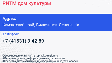 РИТМ, дом культуры по адресу Камчатский край, Вилючинск, Ленина, 1а в дальнейшем Организация, размещена в следующих категориях: