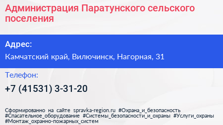 Администрация Паратунского сельского поселения по адресу Камчатский край, Вилючинск, Нагорная, 31 в дальнейшем Организация, размещена в следующих категориях: