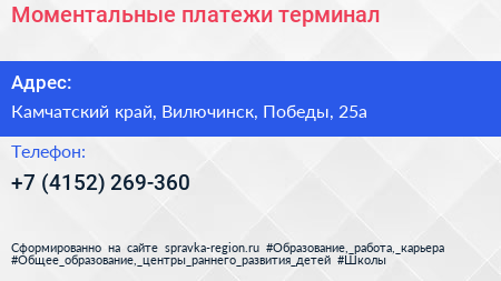 Моментальные платежи, терминал по адресу Камчатский край, Вилючинск, Победы, 25а в дальнейшем Организация, размещена в следующих категориях: