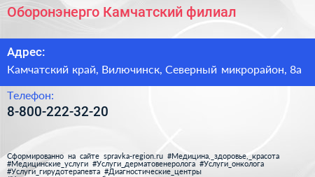 Оборонэнерго, Камчатский филиал по адресу Камчатский край, Вилючинск, Северный микрорайон, 8а в дальнейшем Организация, размещена в следующих категориях: