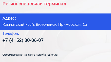 Регионспецсвязь, терминал по адресу Камчатский край, Вилючинск, Приморская, 1а в дальнейшем Организация, размещена в следующих категориях: