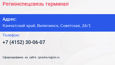 Регионспецсвязь, терминал по адресу Камчатский край, Вилючинск, Советская, 26/1 в дальнейшем Организация, размещена в следующих категориях: