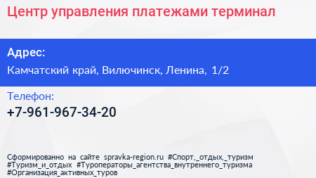 Центр управления платежами, терминал по адресу Камчатский край, Вилючинск, Ленина, 1/2 в дальнейшем Организация, размещена в следующих категориях:
