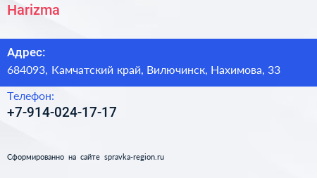 Harizma по адресу 684093, Камчатский край, Вилючинск, Нахимова, 33 в дальнейшем Организация, размещена в следующих категориях: