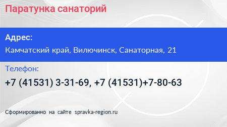 Паратунка, санаторий по адресу Камчатский край, Вилючинск, Санаторная, 21 в дальнейшем Организация, размещена в следующих категориях: