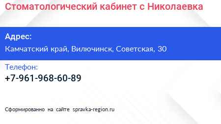 Стоматологический кабинет, с. Николаевка по адресу Камчатский край, Вилючинск, Советская, 30 в дальнейшем Организация, размещена в следующих категориях: