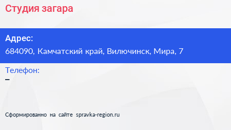Студия загара по адресу 684090, Камчатский край, Вилючинск, Мира, 7 в дальнейшем Организация, размещена в следующих категориях: