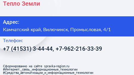 Тепло Земли по адресу Камчатский край, Вилючинск, Промысловая, 4/1 в дальнейшем Организация, размещена в следующих категориях: