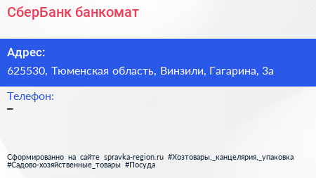 СберБанк, банкомат по адресу 625530, Тюменская область, Винзили, Гагарина, 3а в дальнейшем Организация, размещена в следующих категориях: