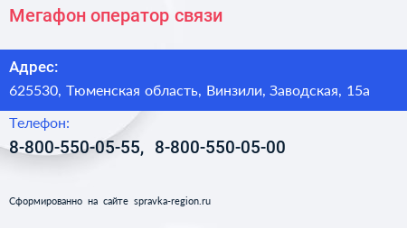 Мегафон, оператор связи по адресу 625530, Тюменская область, Винзили, Заводская, 15а в дальнейшем Организация, размещена в следующих категориях: