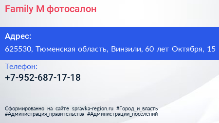 Family M, фотосалон по адресу 625530, Тюменская область, Винзили, 60 лет Октября, 15 в дальнейшем Организация, размещена в следующих категориях: