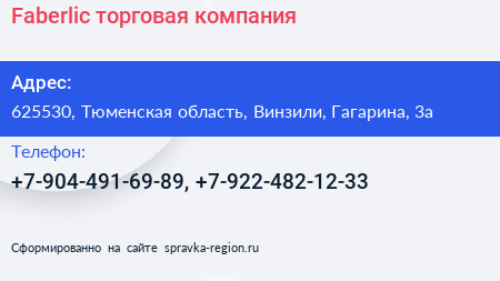 Faberlic, торговая компания по адресу 625530, Тюменская область, Винзили, Гагарина, 3а в дальнейшем Организация, размещена в следующих категориях: