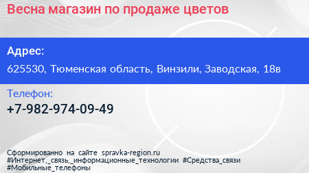 Весна, магазин по продаже цветов по адресу 625530, Тюменская область, Винзили, Заводская, 18в в дальнейшем Организация, размещена в следующих категориях: