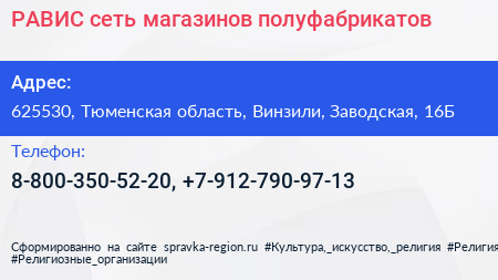 РАВИС, сеть магазинов полуфабрикатов по адресу 625530, Тюменская область, Винзили, Заводская, 16Б в дальнейшем Организация, размещена в следующих категориях: