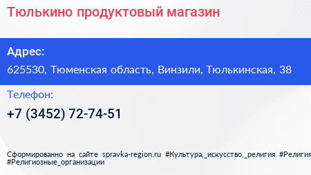 Тюлькино, продуктовый магазин по адресу 625530, Тюменская область, Винзили, Тюлькинская, 38 в дальнейшем Организация, размещена в следующих категориях: