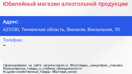 Юбилейный, магазин алкогольной продукции по адресу 625530, Тюменская область, Винзили, Вокзальная, 70 в дальнейшем Организация, размещена в следующих категориях: