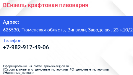 ВЕнзель, крафтовая пивоварня по адресу 625530, Тюменская область, Винзили, Заводская, 23 к10/2 в дальнейшем Организация, размещена в следующих категориях:
