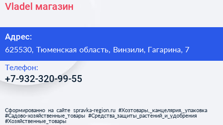 Vladel, магазин по адресу 625530, Тюменская область, Винзили, Гагарина, 7 в дальнейшем Организация, размещена в следующих категориях: