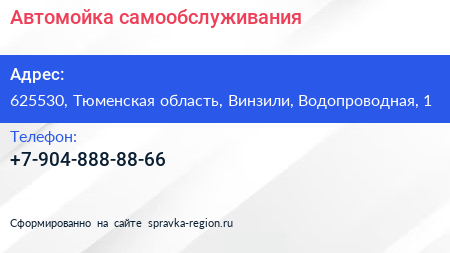 Автомойка самообслуживания по адресу 625530, Тюменская область, Винзили, Водопроводная, 1 в дальнейшем Организация, размещена в следующих категориях: