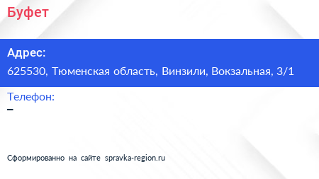 Буфет по адресу 625530, Тюменская область, Винзили, Вокзальная, 3/1 в дальнейшем Организация, размещена в следующих категориях: