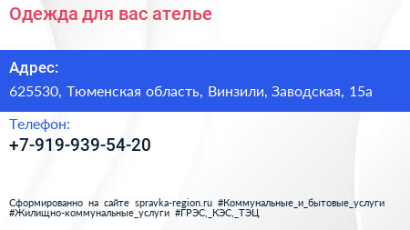 Одежда для вас, ателье по адресу 625530, Тюменская область, Винзили, Заводская, 15а в дальнейшем Организация, размещена в следующих категориях: