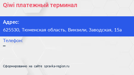 Qiwi, платежный терминал по адресу 625530, Тюменская область, Винзили, Заводская, 15а в дальнейшем Организация, размещена в следующих категориях: