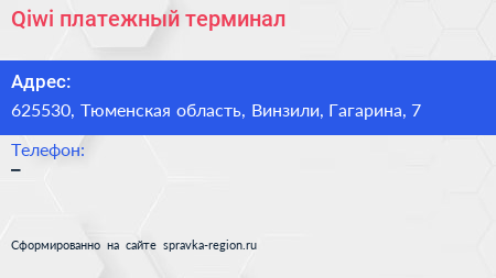 Qiwi, платежный терминал по адресу 625530, Тюменская область, Винзили, Гагарина, 7 в дальнейшем Организация, размещена в следующих категориях:
