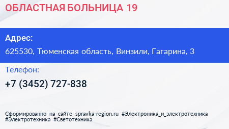ОБЛАСТНАЯ БОЛЬНИЦА № 19 по адресу 625530, Тюменская область, Винзили, Гагарина, 3 в дальнейшем Организация, размещена в следующих категориях: