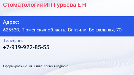 Стоматология, ИП Гурьева Е.Н. по адресу 625530, Тюменская область, Винзили, Вокзальная, 70 в дальнейшем Организация, размещена в следующих категориях: