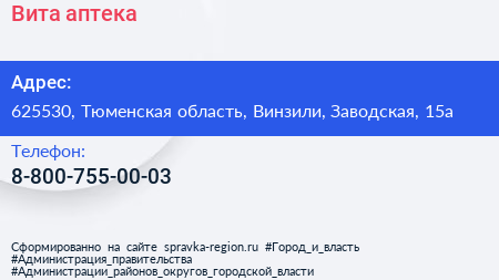Вита, аптека по адресу 625530, Тюменская область, Винзили, Заводская, 15а в дальнейшем Организация, размещена в следующих категориях: