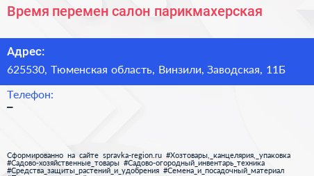 Время перемен, салон-парикмахерская по адресу 625530, Тюменская область, Винзили, Заводская, 11Б в дальнейшем Организация, размещена в следующих категориях: