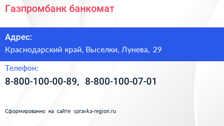 Газпромбанк, банкомат по адресу Краснодарский край, Выселки, Лунева, 29 в дальнейшем Организация, размещена в следующих категориях: