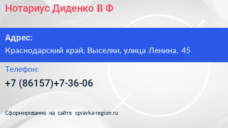 Нотариус Диденко В.Ф. по адресу Краснодарский край, Выселки, улица Ленина, 45 в дальнейшем Организация, размещена в следующих категориях: