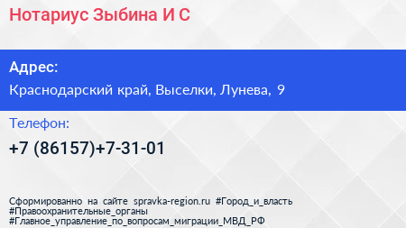 Нотариус Зыбина И.С. по адресу Краснодарский край, Выселки, Лунева, 9 в дальнейшем Организация, размещена в следующих категориях: