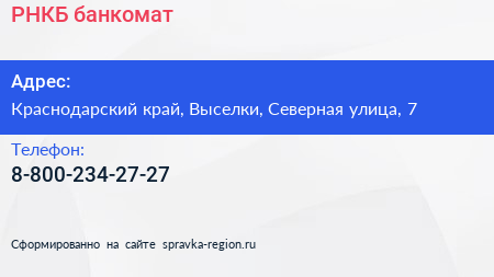 РНКБ, банкомат по адресу Краснодарский край, Выселки, Северная улица, 7 в дальнейшем Организация, размещена в следующих категориях: