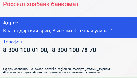 Россельхозбанк, банкомат по адресу Краснодарский край, Выселки, Степная улица, 1 в дальнейшем Организация, размещена в следующих категориях: