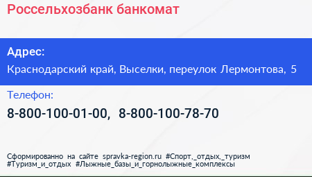 Россельхозбанк, банкомат по адресу Краснодарский край, Выселки, переулок Лермонтова, 5 в дальнейшем Организация, размещена в следующих категориях: