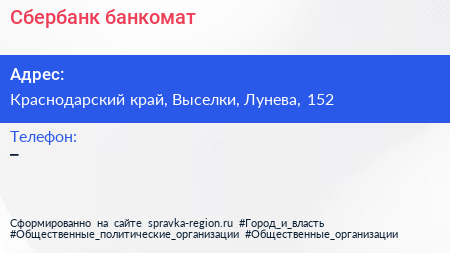Сбербанк, банкомат по адресу Краснодарский край, Выселки, Лунева, 152 в дальнейшем Организация, размещена в следующих категориях: