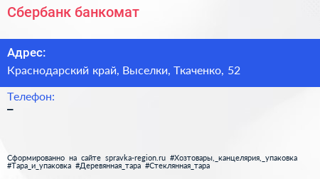 Сбербанк, банкомат по адресу Краснодарский край, Выселки, Ткаченко, 52 в дальнейшем Организация, размещена в следующих категориях: