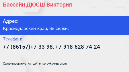 Бассейн, ДЮСШ Виктория по адресу Краснодарский край, Выселки, в дальнейшем Организация, размещена в следующих категориях: