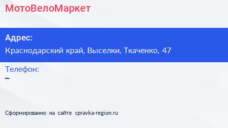 МотоВелоМаркет по адресу Краснодарский край, Выселки, Ткаченко, 47 в дальнейшем Организация, размещена в следующих категориях: