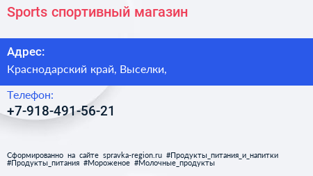 Sports, спортивный магазин по адресу Краснодарский край, Выселки, в дальнейшем Организация, размещена в следующих категориях: