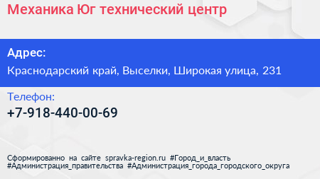 Механика-Юг, технический центр по адресу Краснодарский край, Выселки, Широкая улица, 231 в дальнейшем Организация, размещена в следующих категориях: