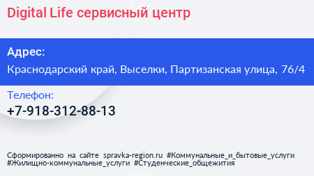 Digital Life, сервисный центр по адресу Краснодарский край, Выселки, Партизанская улица, 76/4 в дальнейшем Организация, размещена в следующих категориях: