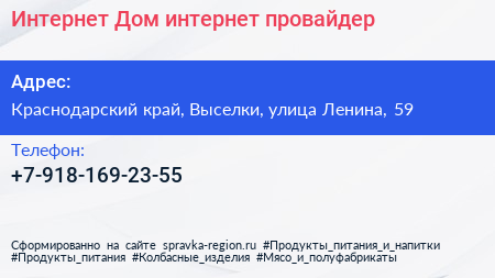 Интернет Дом, интернет-провайдер по адресу Краснодарский край, Выселки, улица Ленина, 59 в дальнейшем Организация, размещена в следующих категориях: