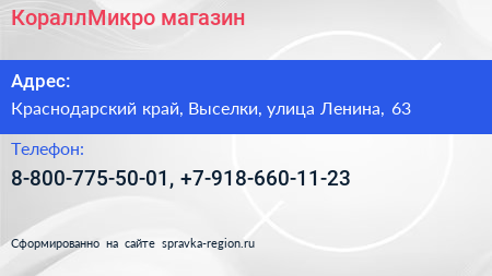 КораллМикро, магазин по адресу Краснодарский край, Выселки, улица Ленина, 63 в дальнейшем Организация, размещена в следующих категориях: